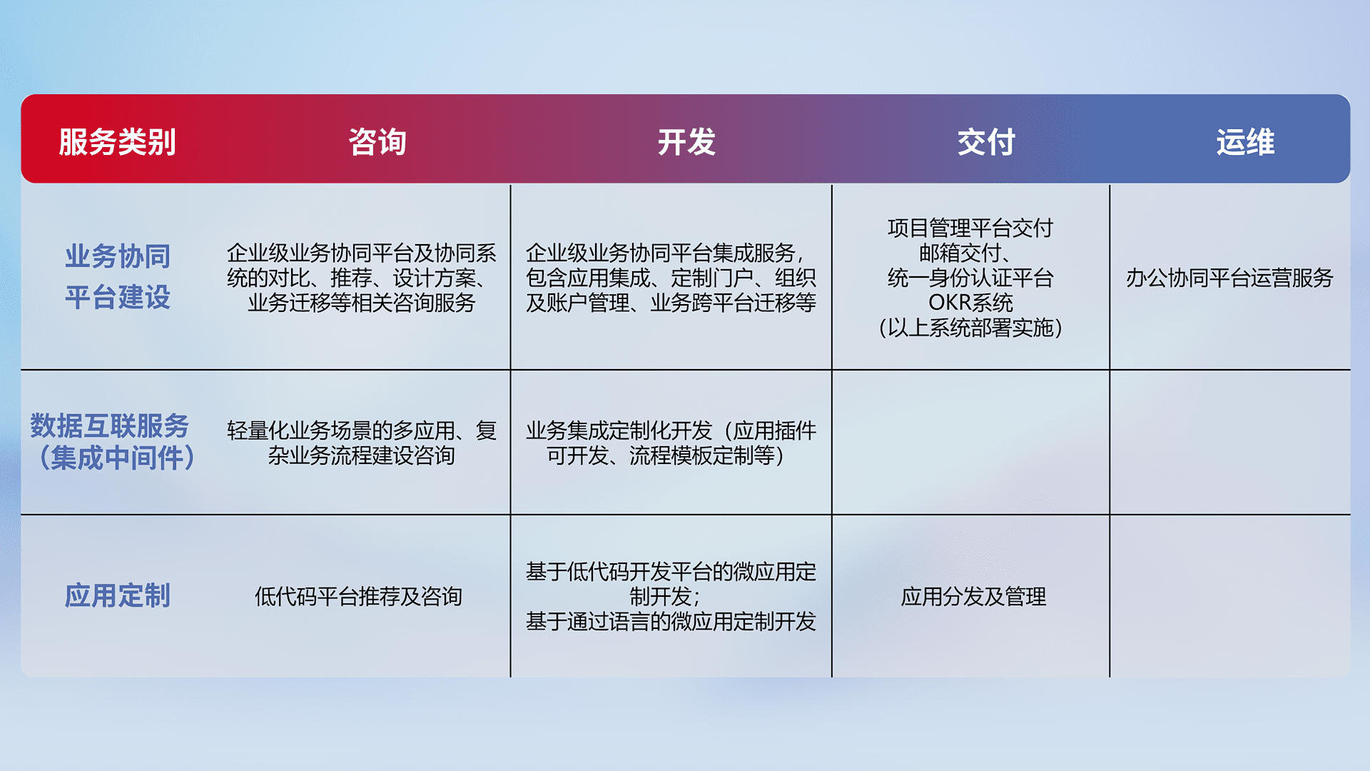 针对钉钉、、、企微、、、、IDaas等平台级产品提供产品的规划、、方案、、、、交付、、定制化开发等服务,,,,实现如统一协同办公、、、智能客户服务、、、混合会议管理、、、智能数据查询、、、等业务场景,,实现数字化转型。。